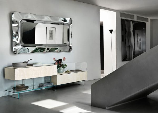 La collection POP, réinvente le miroir. Elle repousse les frontières de l’artisanat et de l’industrie, explorant des techniques de traitement du verre innovantes pour créer l’illusion fascinante d’une surface dure qui devient souple.