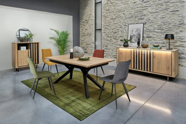 Avec son design soigné, le buffet Dune met en valeur une porte centrale en céramique grise marbrée, agrémentée de montants moulurés et d’un système d’ouverture push. Les portes latérales en placage chêne bénéficient d’une fermeture amortie. Elle repose sur des pieds élégants en métal gris anthracite avec des incrustations en chêne massif et offre un éclairage LED pratique à commande tactile, ainsi que des tablettes réglables pour un rangement optimisé. Disponible en 175cm et 202cm.