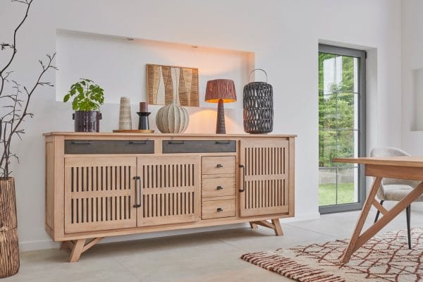 Le buffet Escale offre un bel espace de rangement avec ses quatre portes battantes et deux tiroirs. L’intérieur est organisé par de grandes tablettes derrière les portes gauche et du milieu, ainsi qu’une tablette plus petite à droite. Les deux tiroirs offrent un espace de rangement supplémentaire. Le meuble repose sur des pieds en bois, ajoutant une touche naturelle à son design.