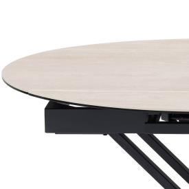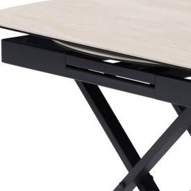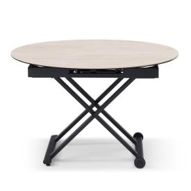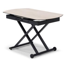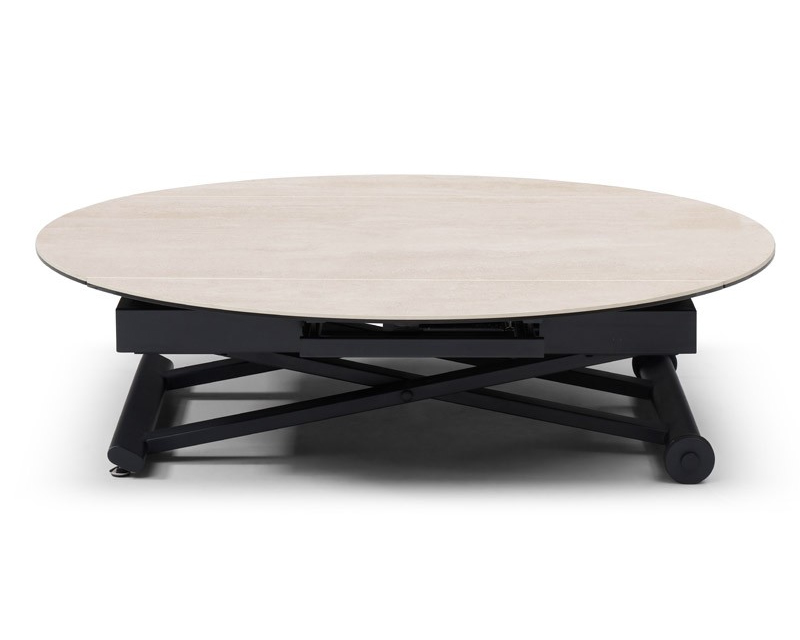 Pour des repas conviviaux même dans un petit espace, découvrez dans notre gamme de la Table relevable STAND UP Travertin qui vous séduira par sa praticité. Spécialement conçue pour s'adapter à tous les espaces grâce à sa modularité. D'un simple geste transformez cette table basse en table repas avec rallonges incorporées. Piétement et châssis en métal laqué époxy noir, plateau et allonges en céramiques 6mm collé sur verre 6mm. Céramiques disponibles : Cold Jade, Pandora, Travertin