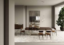 Il s'agit d'une table à manger en verre, verre fondu ou céramique stratifiée sur base métallique . Les plateaux en céramique stratifiée peuvent être choisis parmi une gamme de finitions mates ou polies, rectangulaires ou façonnées. Les bases sont disponibles en finition bronze brossé noir graphite, Titanio brossé, champagne matalisé ou blanc mat.